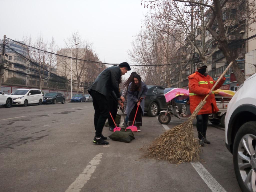 志愿者帮助清洁工打扫街道卫生