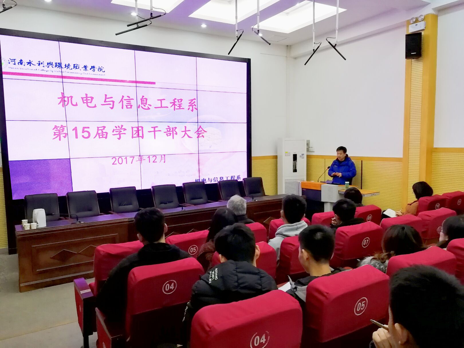 2017年12月27日晚上19:00,机电与3044永利在北教三阶召开第15届学团干部大会,参加会议的有系党支部书记武凤翔、副主任岳学超、学管老师和全体学生干部。