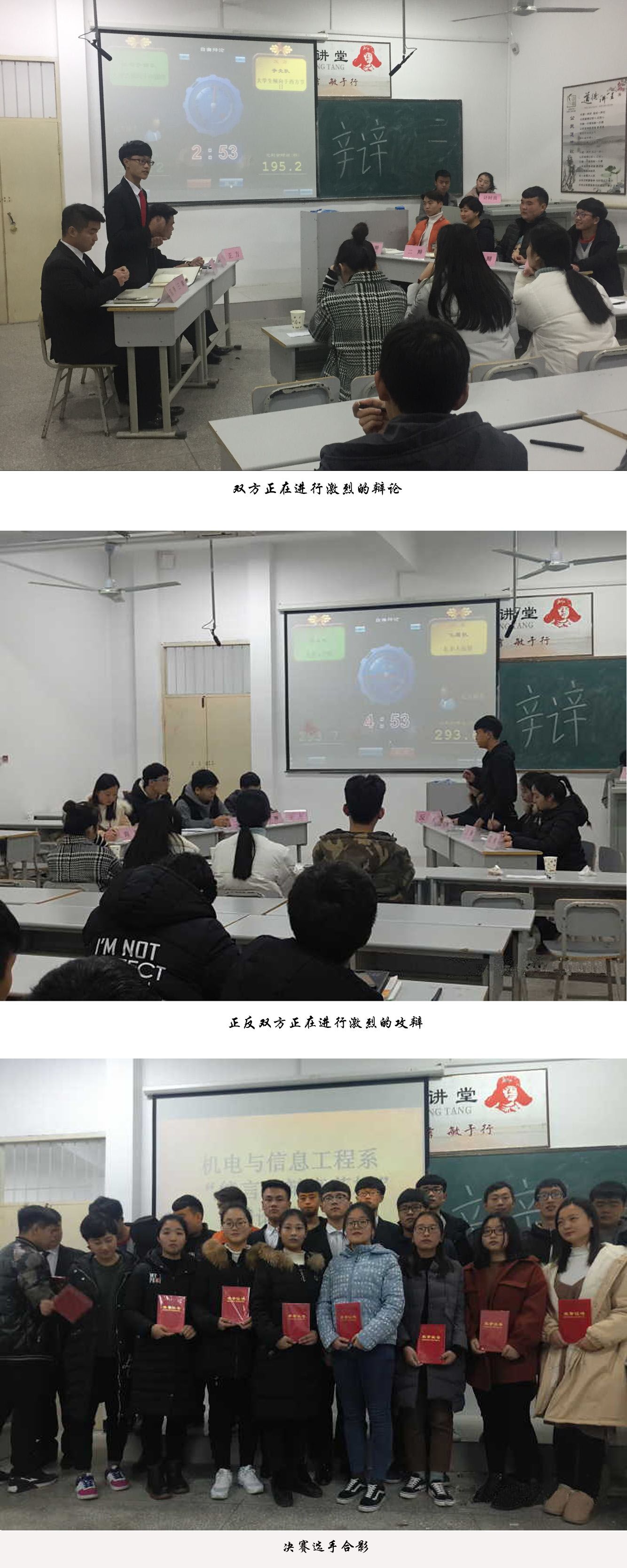 2017年12月20日机电与3044永利在综合楼408举办了“能言善辩真英雄”辩论赛决赛。系副主任岳学超、学管老师及辩论赛全部选手参加。