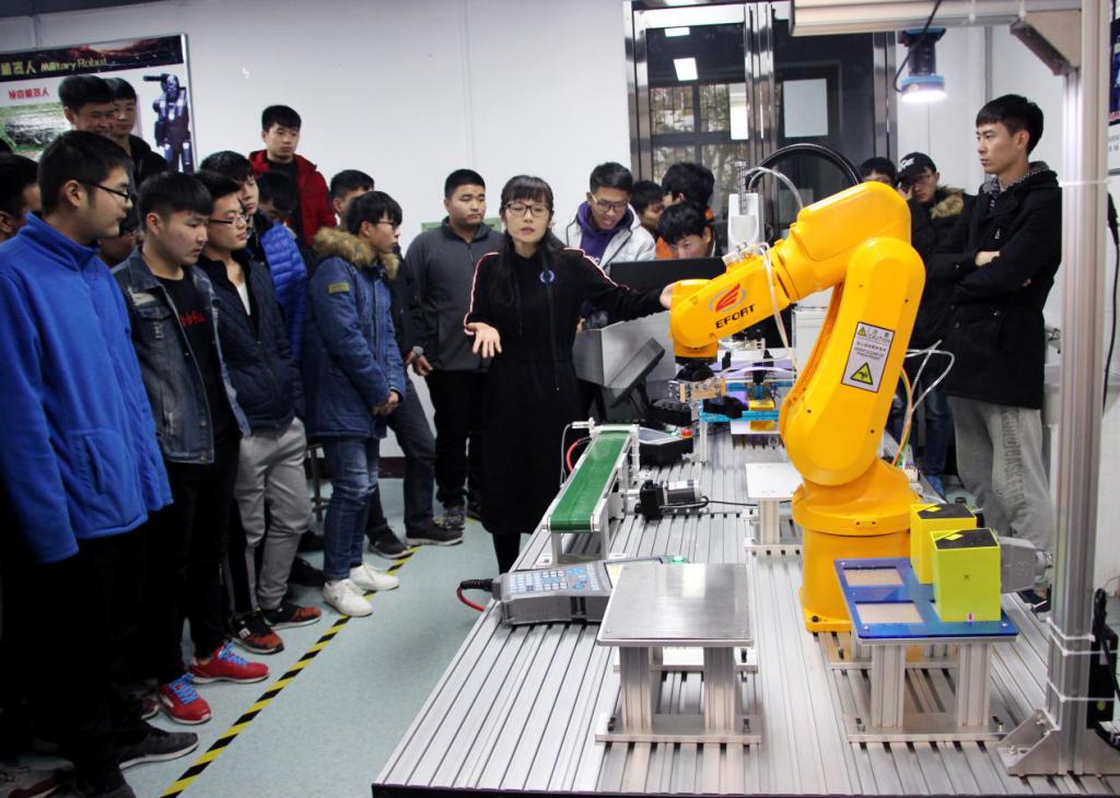 讲座结束后,李老师现场演示了工业机器人整体操作流程,包括搬运、码垛、传送、雕刻一系列的操作流程,让同学们更直观深刻的了解专业知识。