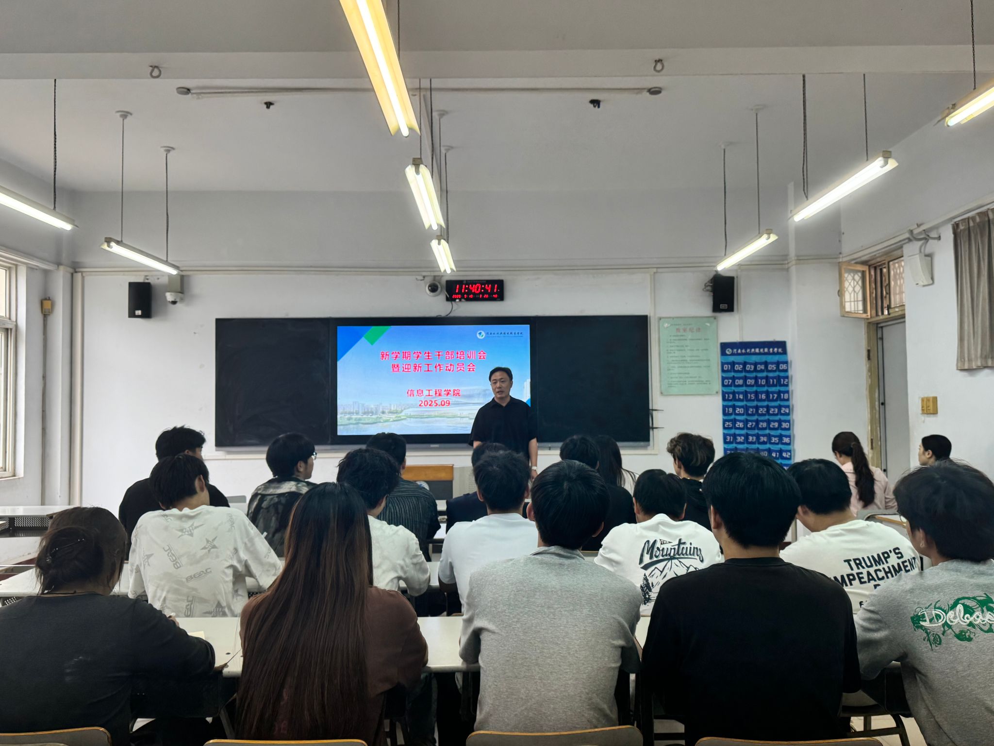 次日召开的学干培训会延续服务育人主题,周颖琦向全体学生干部提出“三心”工作准则:以热心强化服务温度,主动承担秩序引导、行李搬运等实务;以责任心筑牢安全防线,将“安全第一”原则贯穿军训组织、夜间查寝全流程;以沟通力提升服务效能,通过“一对一”精准对接新生需求。会议特别强调学生干部要发挥桥梁纽带作用,在迎新工作全过程中展现“信息学子”的良好风貌。
