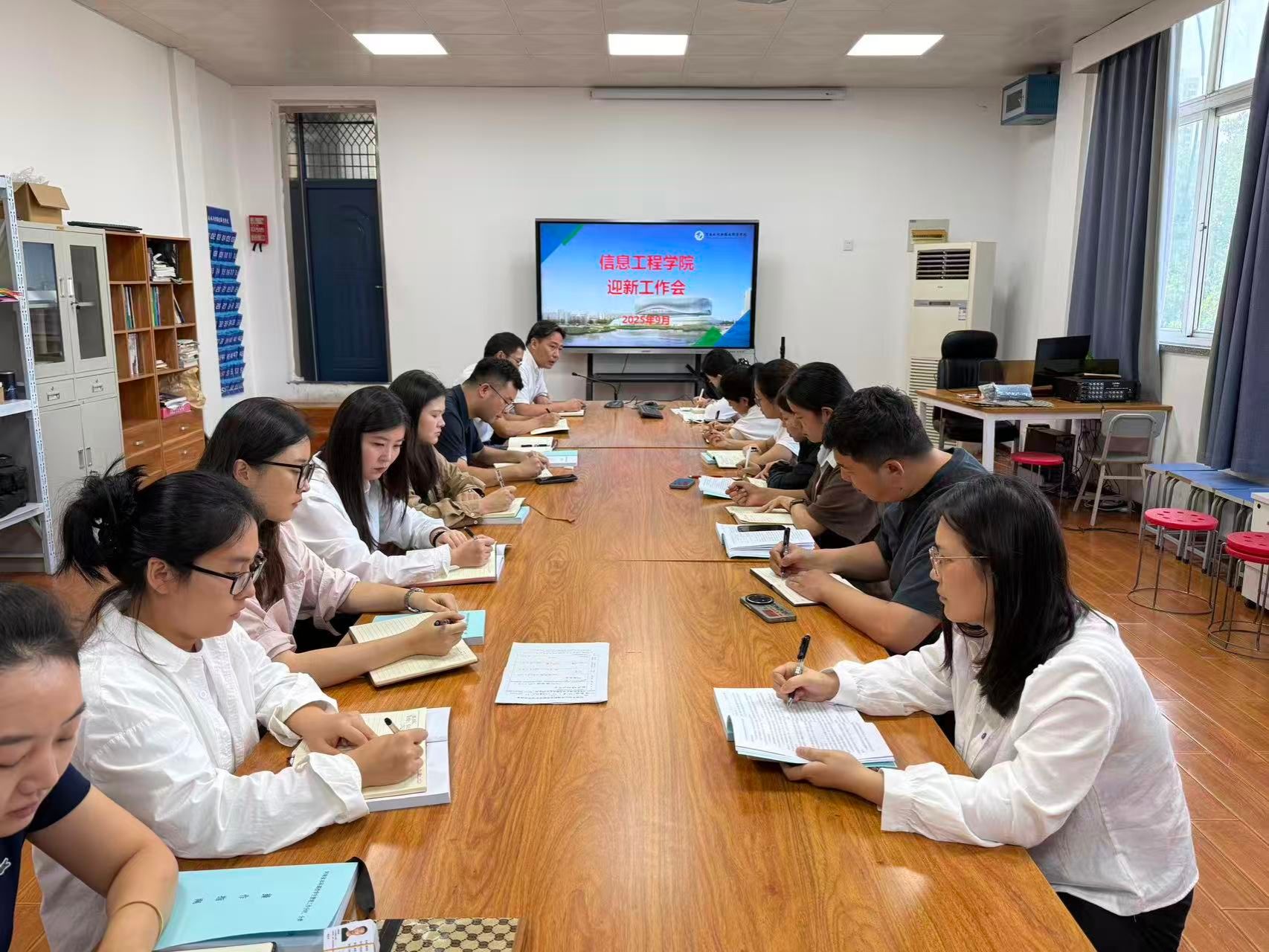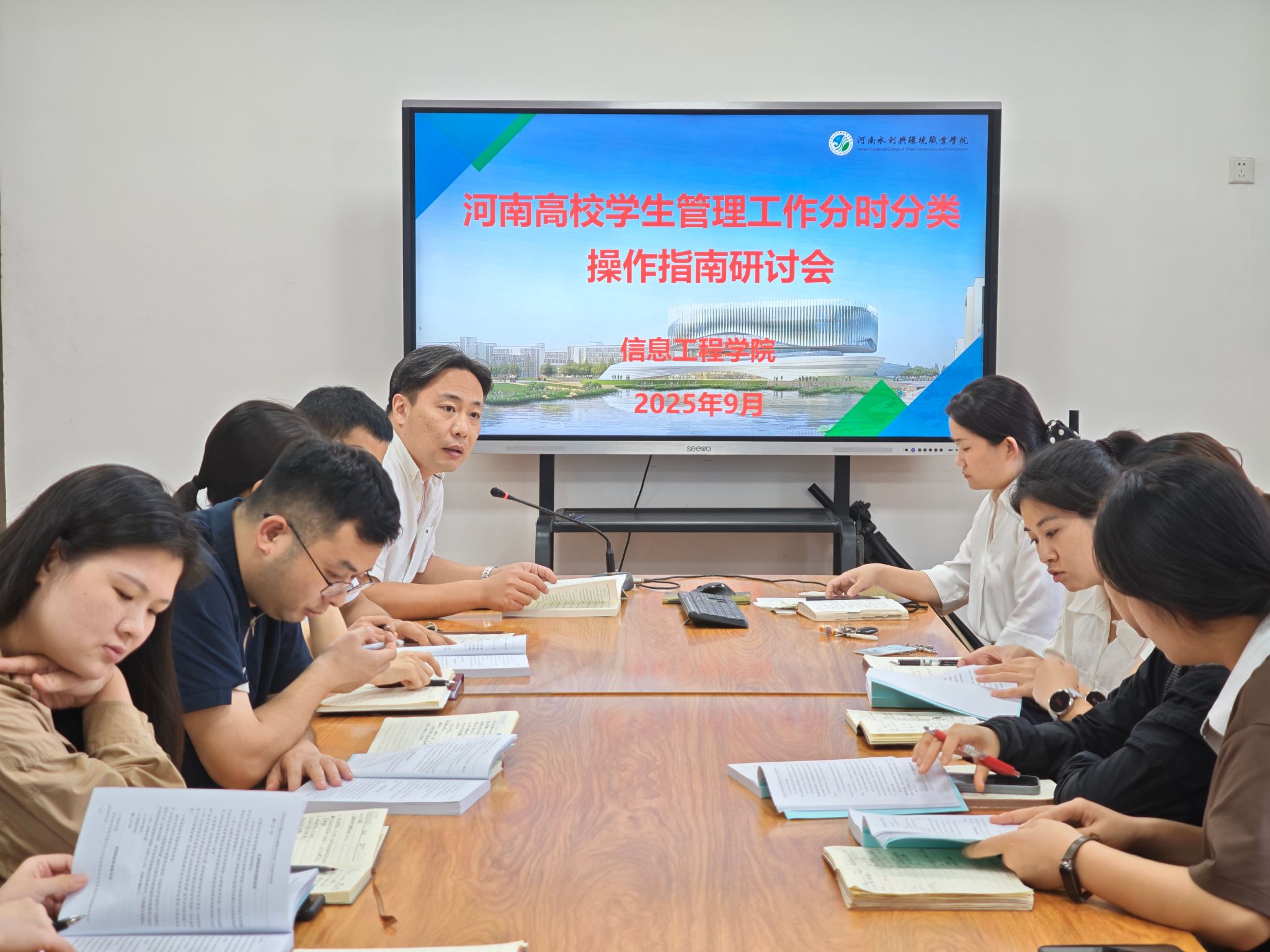 在9月9日的迎新工作会上,周颖琦书记围绕“以学生为本”核心理念,重点部署三项安全服务工作:一是建立暴雨预警应急响应机制,提前制定防汛安全预案,确保报到期间校园通道畅通无阻;二是构建“问题解答-舆情监测”双闭环系统,要求迎新人员及志愿者以“耐心、专业、共情”态度解答学生和家长疑问,实时排查化解矛盾;三是规范档案审查与帮扶流程,严格执行考生档案人脸比对核验,系统开展新生宗教信仰、身心健康筛查,规范推进助学金评定工作。在专题研讨会上,学院组织教师集中学习《河南高校学生管理工作分时分类操作指南》,重点研讨新生入学教育、日常管理、突发事件处置等模块的操作规范,要求将指南转化为具体工作举措,提升学生管理科学化、精细化水平。