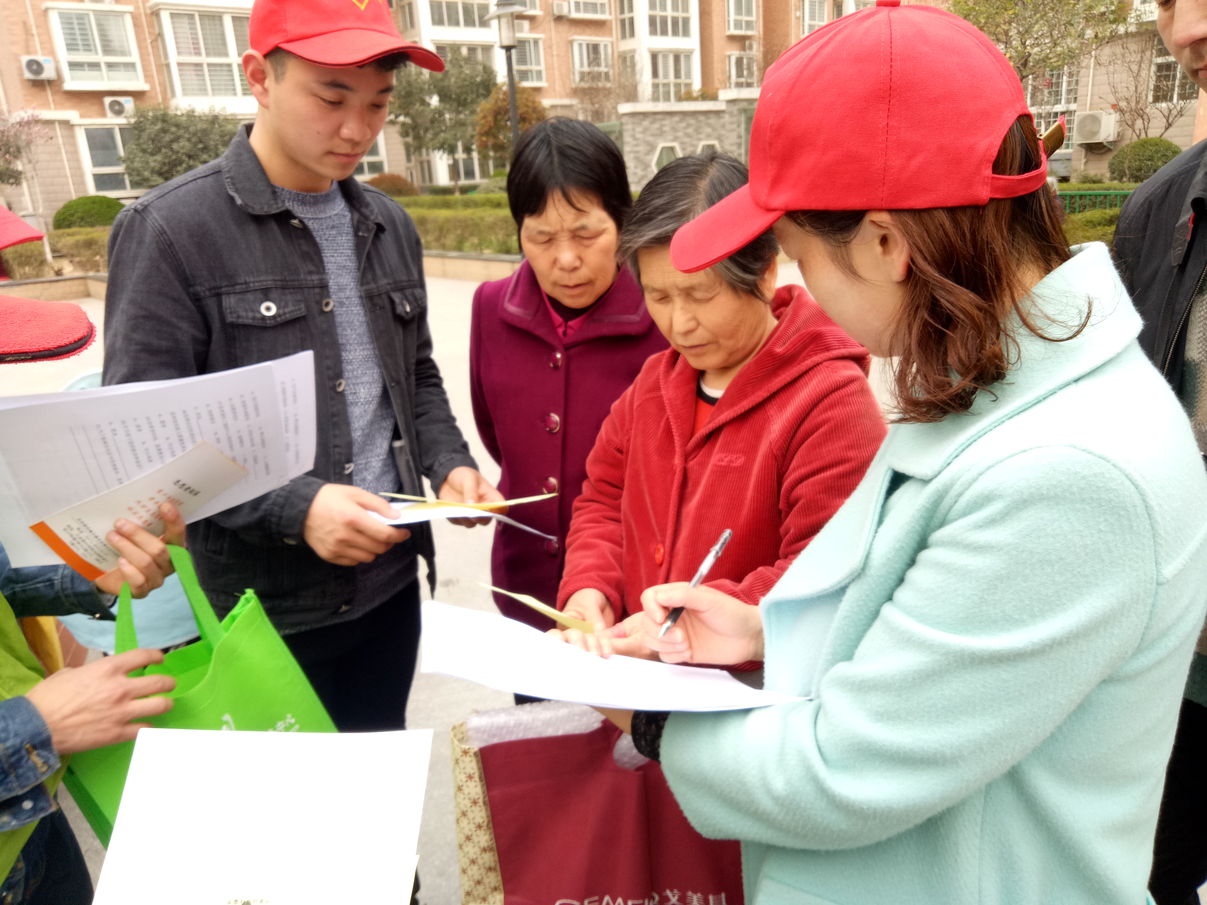 托老站门口集合,志愿者分三组分别向华瑞·紫桂苑、主语城和圣地花园三个小区出发,