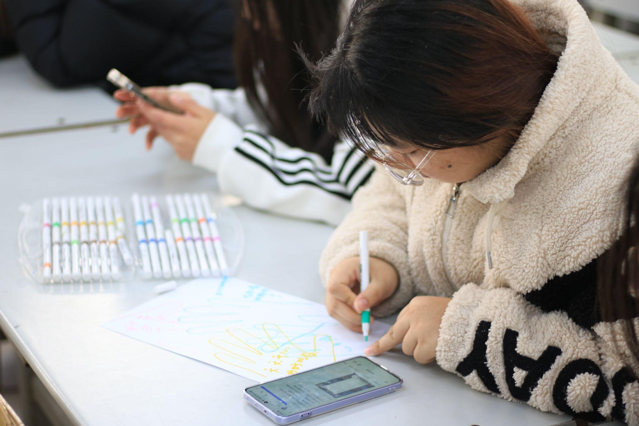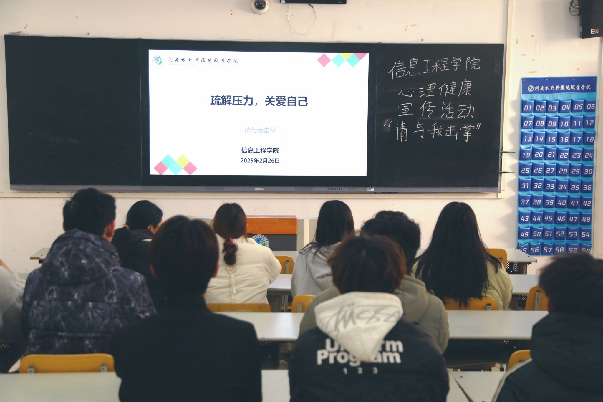 “心灵放映室”里,影片内容触动心灵,同学们在沉浸式观影中领悟心理健康的重要性,教室座无虚席;“心灵绘画接龙”中,大家借画笔释放压力,交流创作灵感,有效增进彼此间理解与沟通;“请与我击掌”活动中,同学们用色彩写下新年期许与鼓励话语,传递积极信念;“优点大轰炸”环节,分组书写、分享优点,极大增强了同学们的自信心,现场氛围热烈。