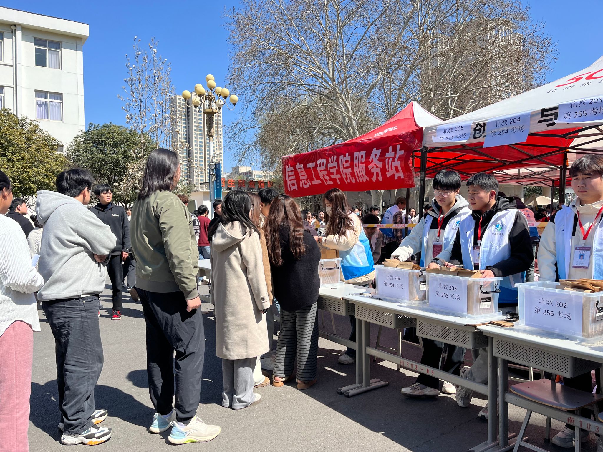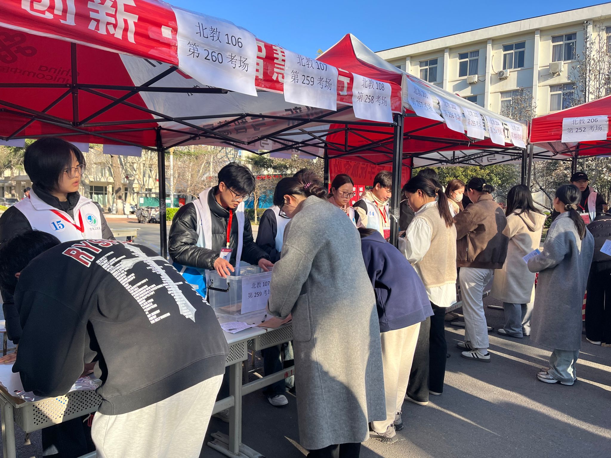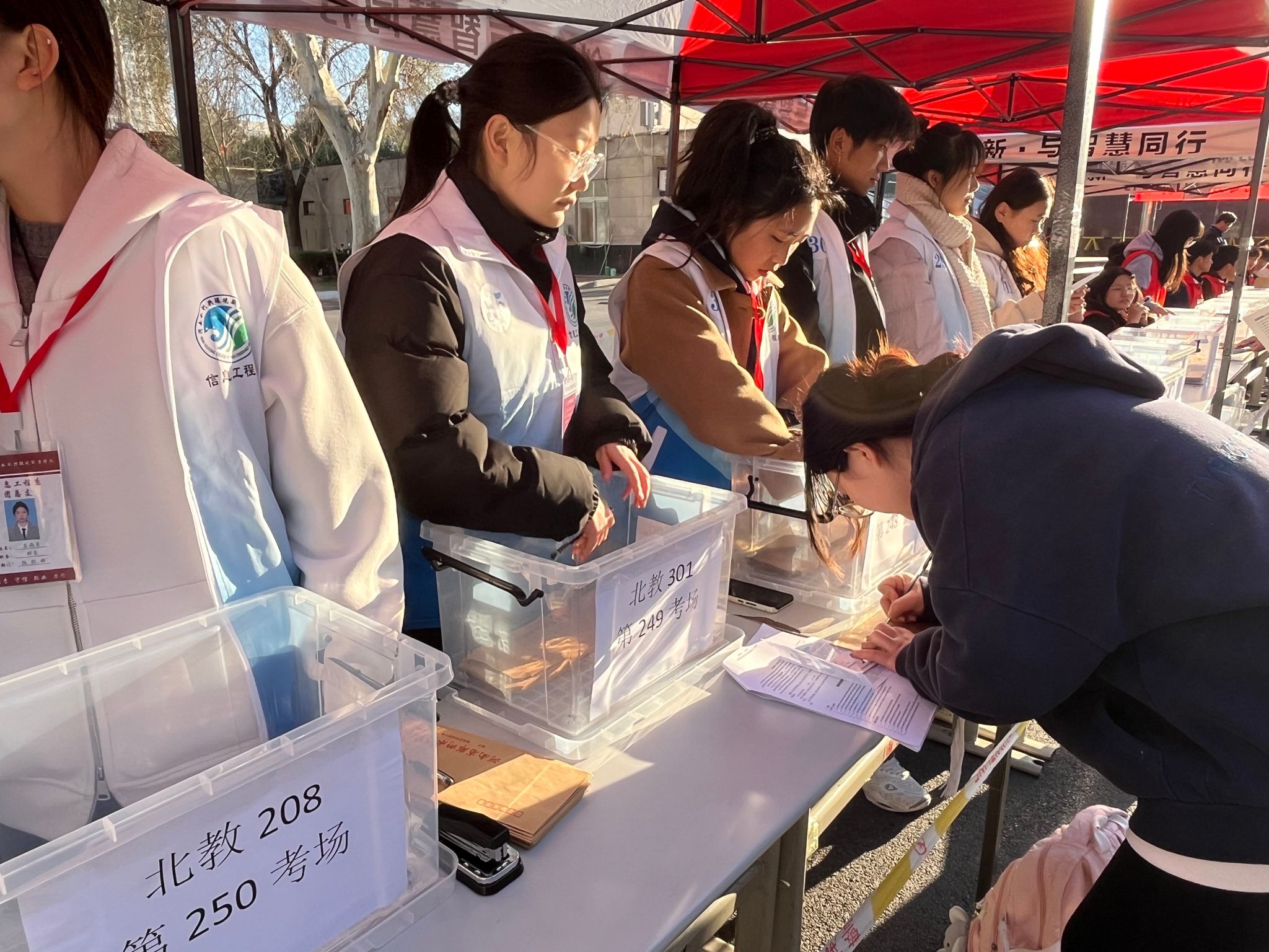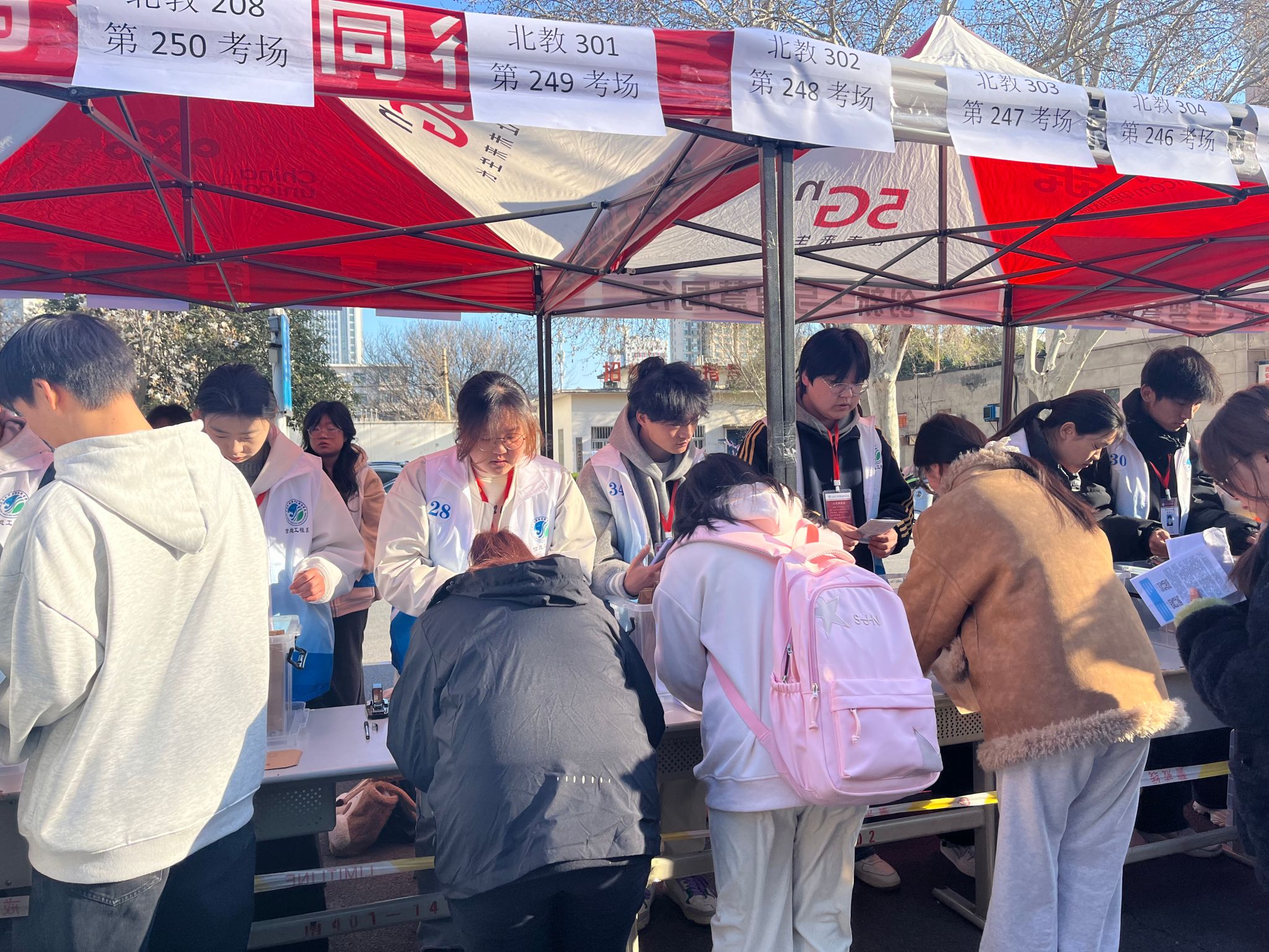 在“爱心助力专升本,志愿服务伴梦行”专升本志愿活动中,志愿者们为考生提供手机保管、现场答疑等保障服务,助力考生安心考试。