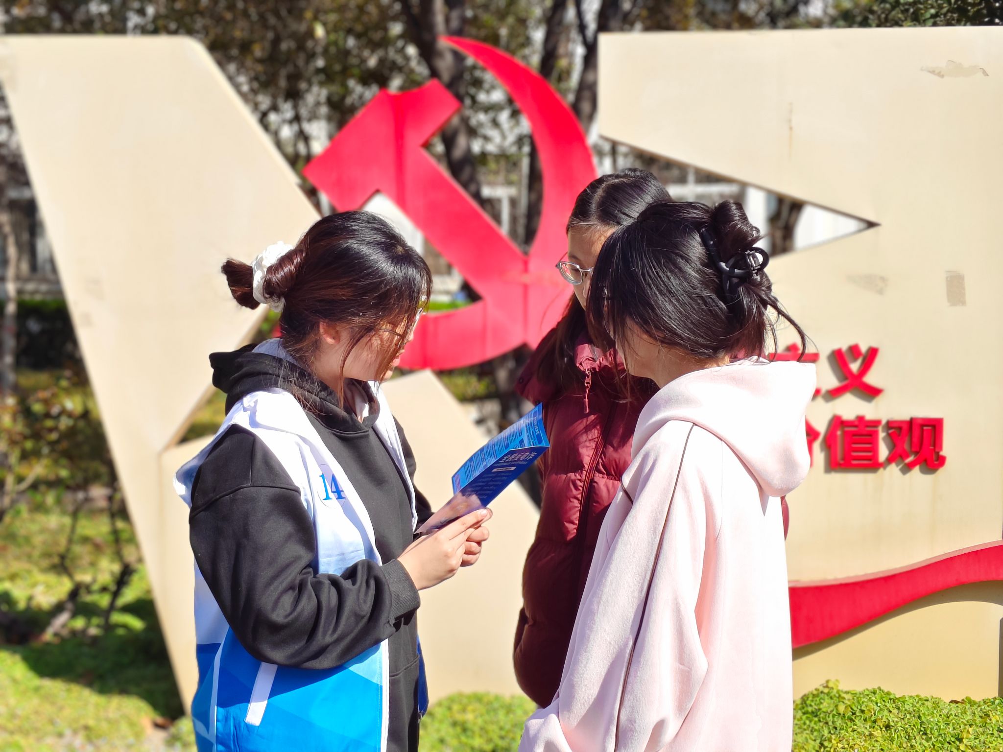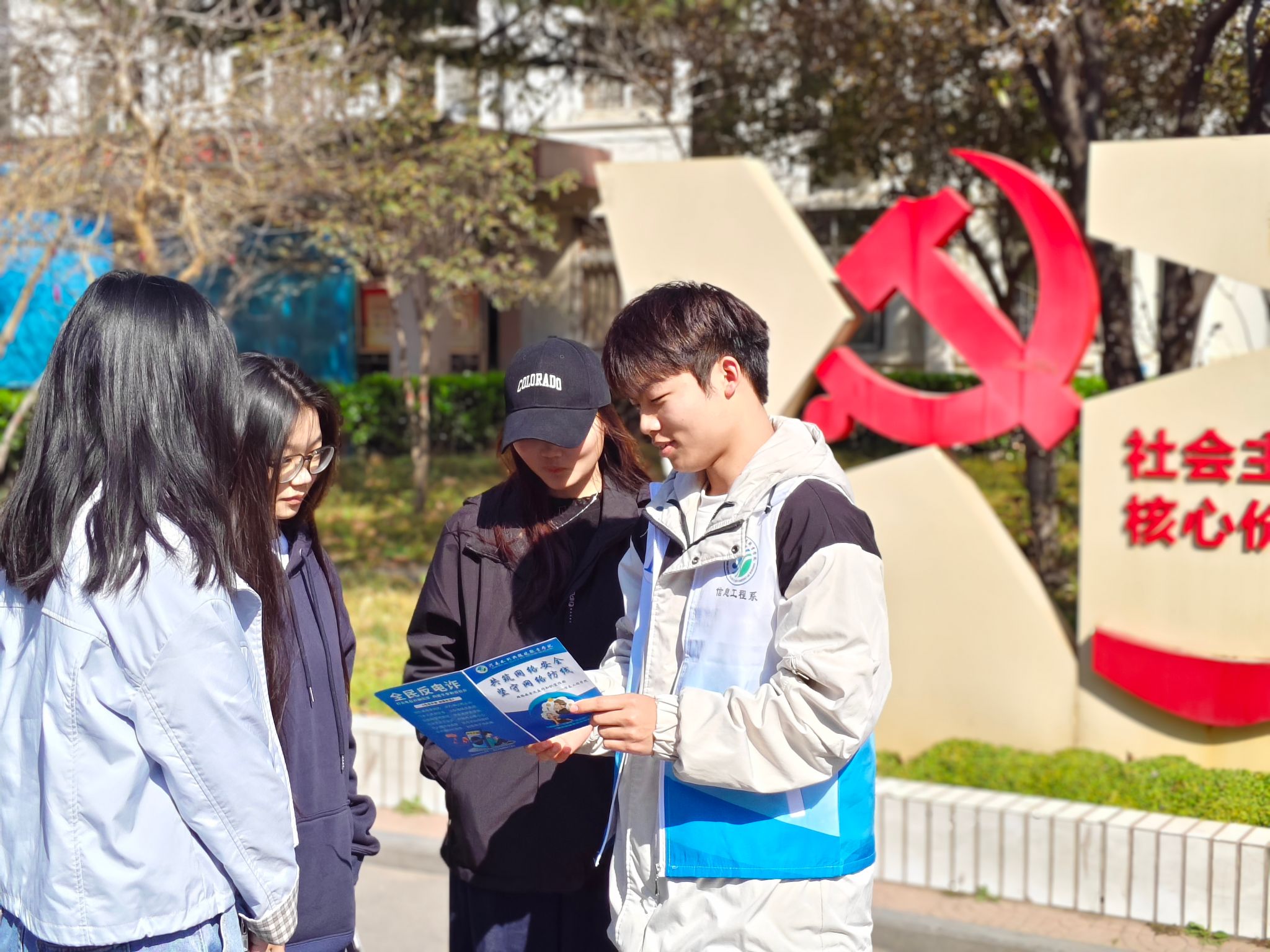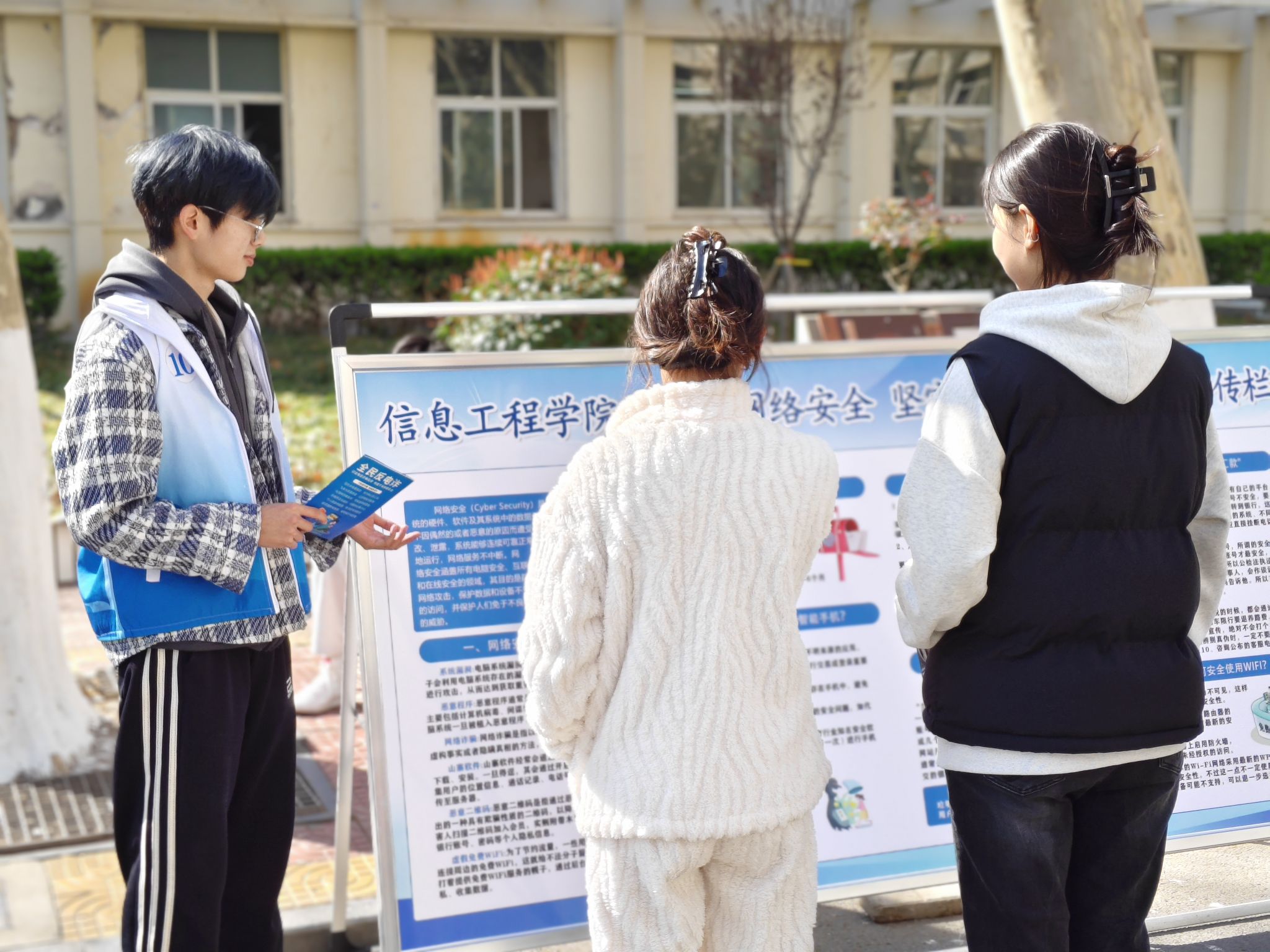 在“共筑网络安全,坚守网络防线”网络安全及反诈知识宣传活动中,志愿者们在校园里开展网络安全教育、防诈知识及校园诈骗典型案例宣讲,向学生们讲解、普及相关内容,筑牢校园反诈防线。