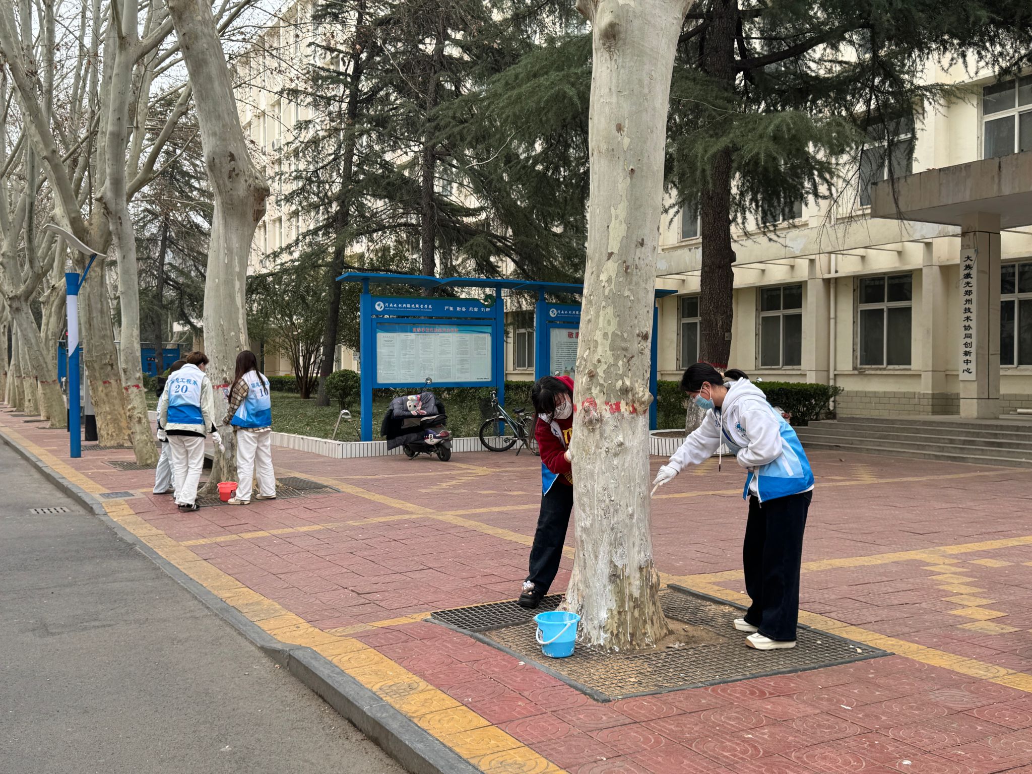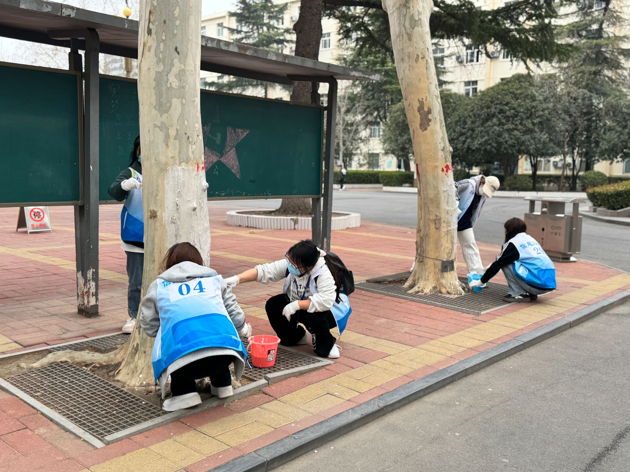 在“践雷锋精神,护校园新绿”涂树活动中,志愿者们使用涂白剂为校园树木“换新装”,增强树木抗病虫害的能力。