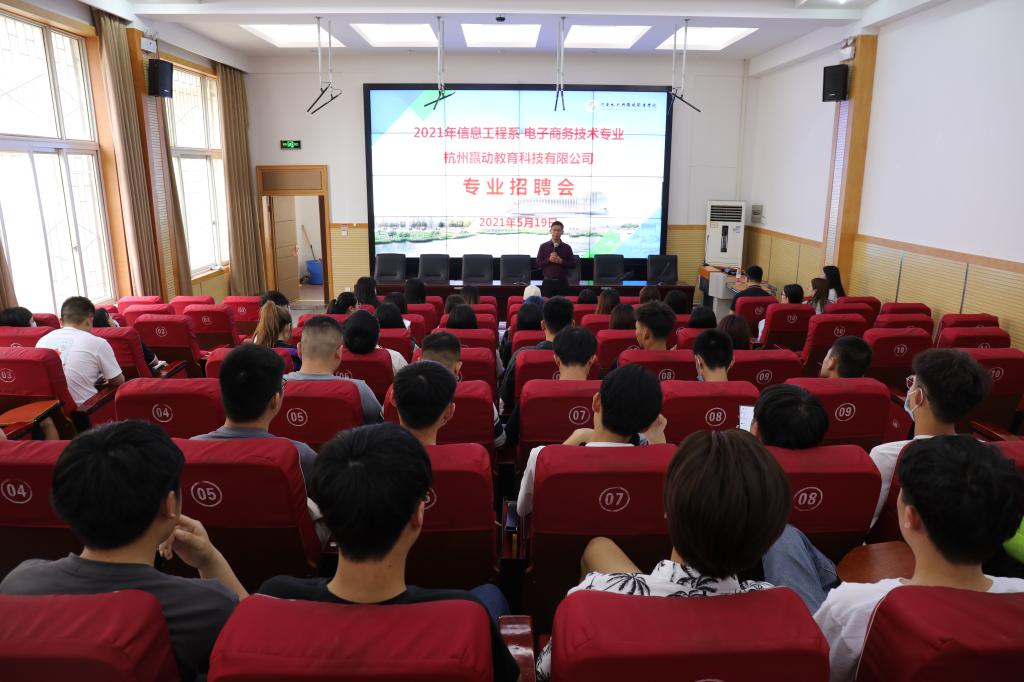 5月19日,3044永利举办杭州赢动教育科技有限公司专场招聘会,由公司人事总监许振兴主讲,系2019级电子商务技术专业全体在校生及班级职业导师参加。